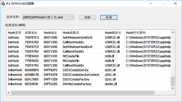 下载APIHook是一款专业的扫描工具软件。使用者可以通过软件扫描程序进程,对进程中的hook类型、函数地址、hook地址、hook函数名、hook模块名、hook所在模块等进行检测。软件的界面比较简洁,功能布局直观清晰,使用起来也非常简单。