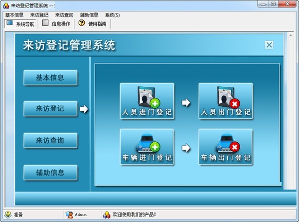 下载来访登记管理系统是一款专业的来访登记的管理工具软件。软件可以帮助使用者能够管理记录来访人员的信息,支持人员进门、出门登记以及车辆的进门、出门登记。还支持来访记录快速查询和辅助信息查询,使用起来非常简单和方便。