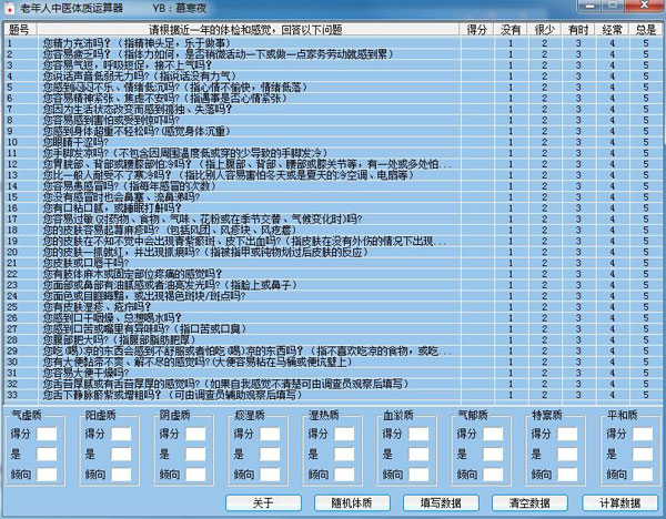 下载老年人中医体质运算器是一款专业针对老年人体质的运算工具软件。使用者通过软件填写相关问卷,软件可以根据使用者的回答估算使用者当前的身体状态。软件的界面简洁无广告,布局直观,使用起来也非常简单和方便,只需回答一下问卷即可获取结果。