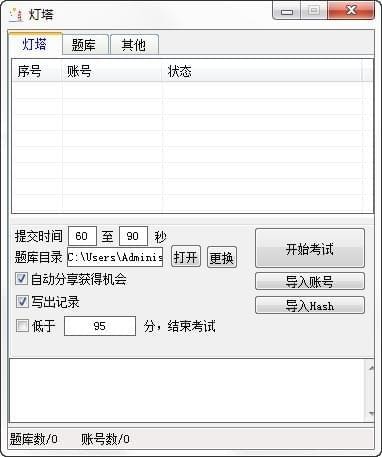 下载灯塔党建答题软件是一款专业的答题的辅助工具软件。使用者可以将答题的题库、账号、以及hash导入软件。在灯塔页面设定提交时间、题库目录,根据需求可以勾选写出记录、自动分享获得机会等选项。之后点击开始考试即可开始答题。