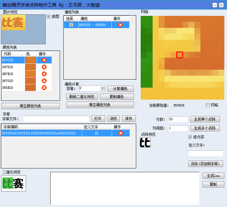 下载触动精灵字库工具是一款专业的字库文件、点阵代码的生成工具软件。软件支持抓图取色、截图找字、计算偏色等等功能。软件可以帮助使用者快速制作字库文件以及生成单个或多个点阵。软件的界面布局直观、功能一目了然,使用起来也非常简单。