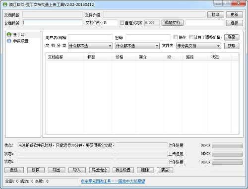 下载漠江豆丁文档批量上传工具是一款专业的文档批量上传的工具软件。使用者可以通过软件批量上传不同格式的文档文件包括doc、xls、ppt、pdf、txt等。软件支持对上传的文件进行文档分类,可以自动获取、修改文档的标签,便于使用者可以快速找到需要的文档。