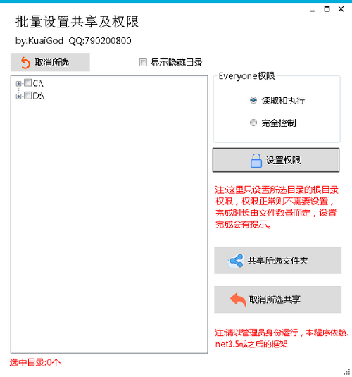 下载批量设置共享及权限是一款专业的文件批量共享的工具软件。软件可以帮助使用者批量共享选择的文件以及文件夹。使用者可以设置共享的权限包括读取与执行或是完全控制。软件的使用方法也非常简单,勾选需要共享的文件夹目录,点击共享所选文件夹即可。