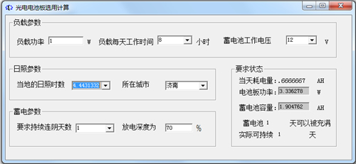 光电电池板选用计算输入负载参数和负载每天工作时间,蓄电池工作电压,以及当地有效日照时间,光电电池板选用计算免费版可计算出当蓄电池充满电时间,以及实际可工作时间。