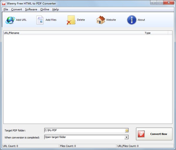 Weeny Free HTML to PDF Converter虽然有很多菜单,但所有功能都集中在界面中,你只需要点击“add url”后输入网址,在软件底部选择pdf文档保存的路径,点击“convert now”即可完成。