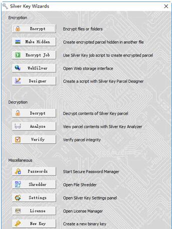 Silver Key Standard是一款专业的文件加密的工具软件。使用者可以通过软件对任何类型的文件进行加密保护,主要用途在于传输文件时为文件进行加密,以此达到数据传输安全的目的。软件的功能布局也很合理直观,使用起来非常方便。