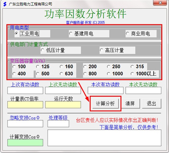 打开功率因数分析软件绿色版,选择用电类型、供电部门计量方式、变压器容量