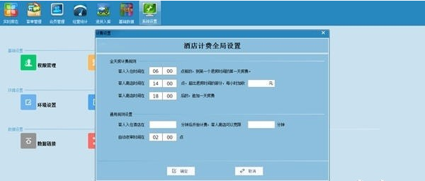 7.系统设置:员工权限设置、公司信息设置、操作日志记录、硬件相关配置、优惠额度设置默认付款方式设置、计费设置、夜审设置、数据连接、数据清除、数据恢复设置等
