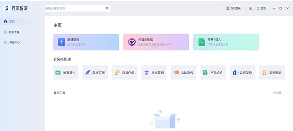 《万彩智演》是一款能让用户快速制作出ppt的软件,软件具备多项智能功能,包括智能排版、智能配色和智能动画等,用户只需简单输入内容和选择模板风格,就能自动根据文本内容和设定生成出合适的方案,保证每页都呈现出精美的设计效果。