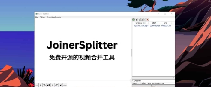 《JoinerSplitter》是一款很好用的视频合并软件,软件可以帮助用户将多个视频文件合并成一个大文件,该软件支持多种视频格式,很适合用来打造创意视频,还提供了丰富的视频编辑功能,帮助用户轻松调整视频的效果。