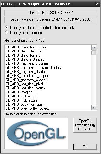 显示显卡支持的 OpenGL 扩展,或显示所有现有的 OpenGL 扩展,无论您使用什么显卡。对于每个扩展,您可以在 OpenGL 扩展注册表或 NVIDIA 的 OpenGL 扩展规范中打开其描述网页。对于图形开发人员来说非常方便!