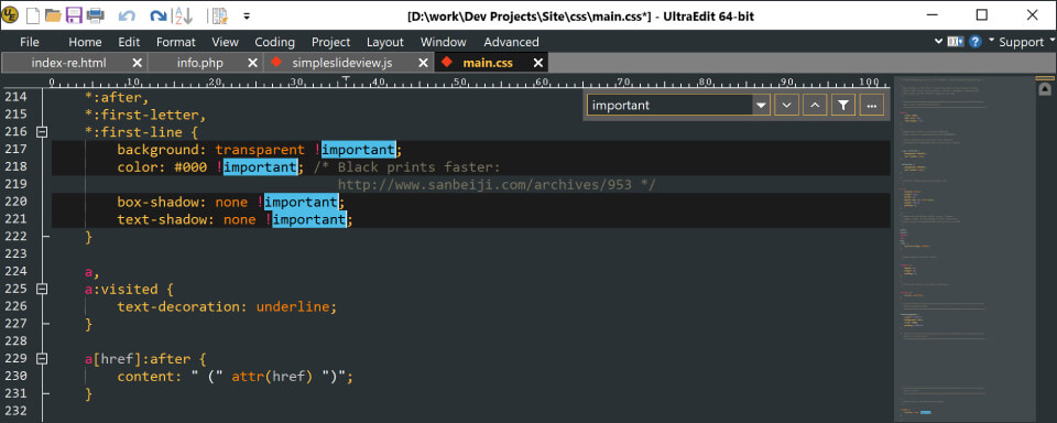 UltraEdit 的无所不知的搜索功能可以跨文件夹和目录查找文件,甚至可以在 4GB 的文件中查找文件。使用各种筛选器(如正则表达式)来微调搜索
