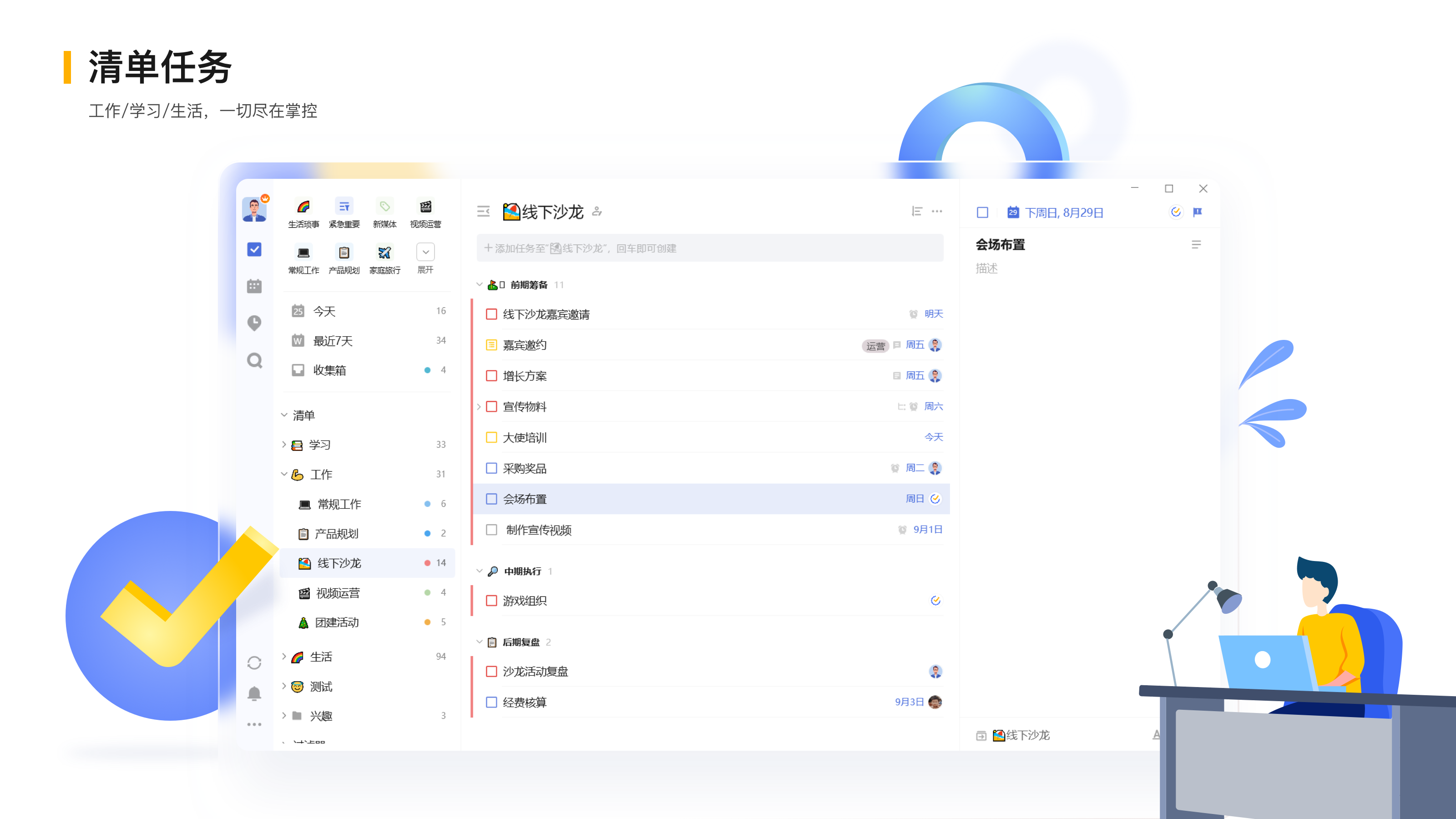 1、列表:在列表视图中,内容会以三栏的形式呈现,逻辑层次一目了然。第一栏是列表分类,方便你管理和分类任务。第二列显示任务列表,帮助您快速浏览每项任务及其日程。第三列是任务细节区,在这里你可以添加注释,插入图片,甚至用Markdown语法创建。