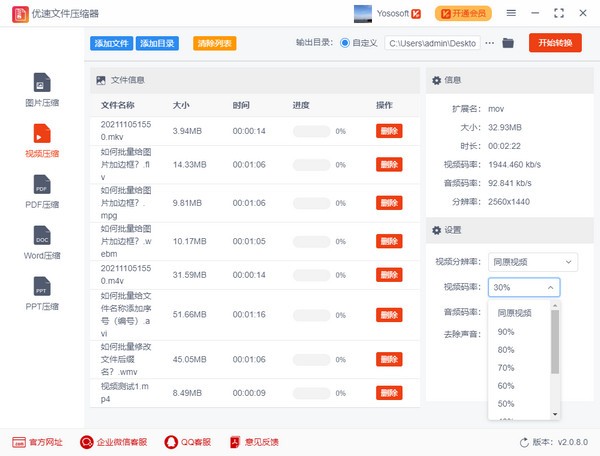 支持MP4、flv、avi、mov、wmv、mkv等十余种视频格式,可对视频分辨率进行快速的压缩。