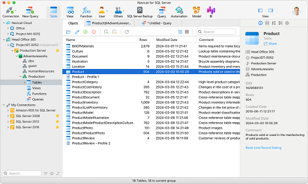 Navicat Premium Mac版是一款功能强大的数据库管理和开发工具,软件非常实用,界面体验好,专门为在macOS上使用Microsoft SQL Server数据库而设计,提供了一个直观的SQL编辑器,您可以在其中编写和执行SQL查询或脚本,还提供了各种管理和可视化数据的工具,支持不同数据库之间的数据同步,并使您可以轻松地在多个环境中保持数据最新,可以满足专业开发人员的所有需求,感兴趣的赶快下载使用吧!