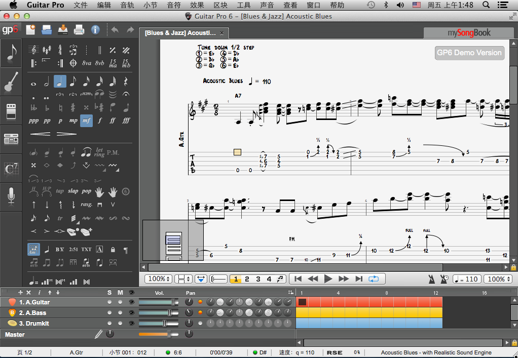 我们重新设计了调谐窗口,使其更加直观和易于使用。现在,只需一键点击,即可逐个自定义吉他Pro 7.6曲目的调音效果。