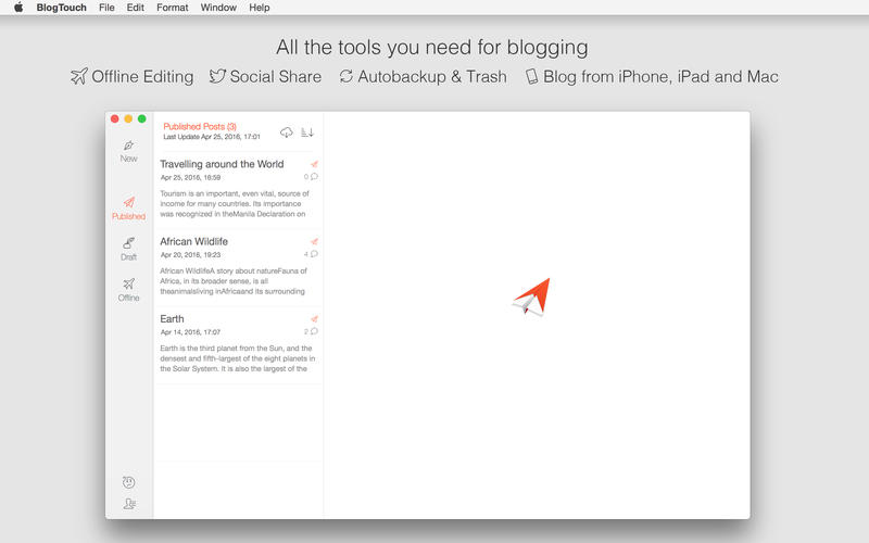BlogTouch Mac版是一款非常实用的编辑器软件,软件功能强大,支持通过 Twitter、 Facebook、 电子邮件和其他的网络共享,可以安全地删除你的帖子,通过将它们发送到回收站(脱机存储区),可以帮助用户轻松管理博客,改善用户体验,更流畅地使用博客,需要的朋友们可以前来下载使用吧!