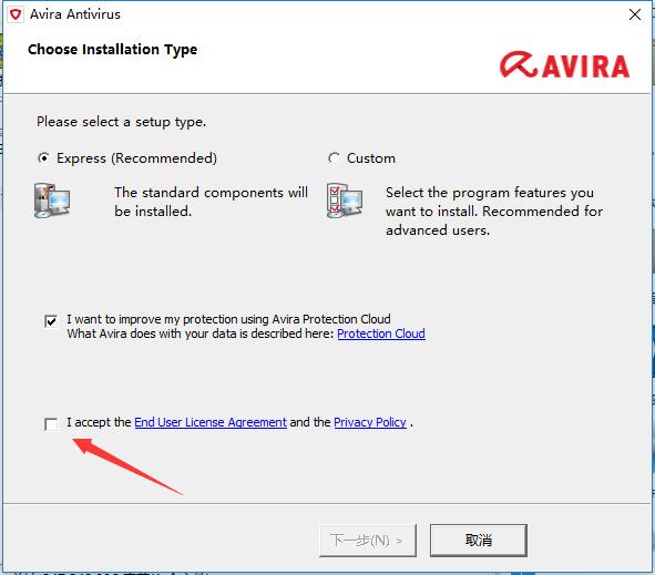 3、勾选红色箭头处的接受条款选项,点击下一步。