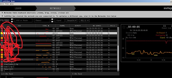 查看2.4GHz频段信道使用情况,这是inSSIDer非常有亮点的一个功能(纵坐标:信号强度,横坐标:14信道)。在这里我们不仅可以看到每个无线热点所占用的无线信道,还能看到该热点的信号强度。此时,信号强度强,占用信道不拥挤的无线热点就是你的选择。