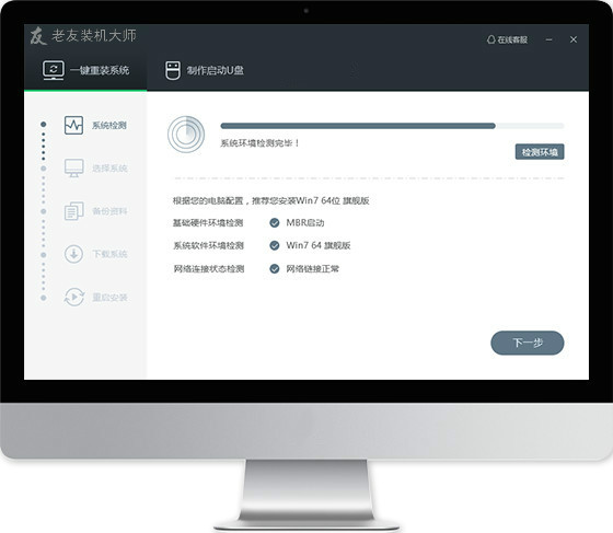 下载软件完软件后正常打开(“一键重装系统”),程序会默认检测当前系统环境,检测完成后,点击“下一步”。