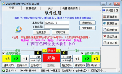 2016篮球计时计分系统完全可以支持所有尺寸的LED屏,除了精准计时、计分、24秒、球员得分、犯规、暂停、进功方向等信息的显示之外,还自带20种场上用到的气氛助场音乐,以及程序内部代码优化和BUG修复,本系统并无需连接其它的硬件设备,只需要一台电脑即可以简单的完成操作,通过键盘的快捷键来控制系统的计时计分功能,篮球计时计分系统操作简便、功能齐全、稳定可靠,适用于国内各类体育场馆。