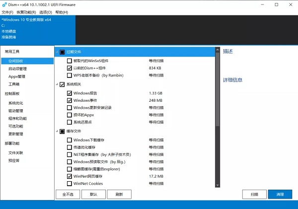 Dism程序启动后,点击空间回收即可看到此界面。然后选择需要清理的项目,点击扫描(估计空间可以释放)或者直接点击清理(不估计大小立即删除)。