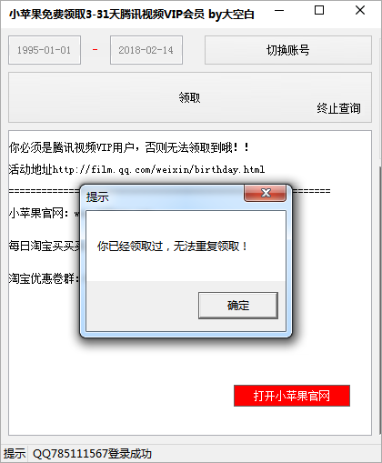 小苹果免费领取3-31天腾讯视频VIP会员是一款非常实用的腾讯vip会员免费领取工具,软件界面简洁,操作简单易用,能够非常轻松的领取腾讯VIP免费试用会员,3到31天不等的VIP会员奖励,必须自身就是腾讯视频vip会员才可以领取到哦,一年只能领取一次,有需要的小伙伴赶快前来下载使用吧!