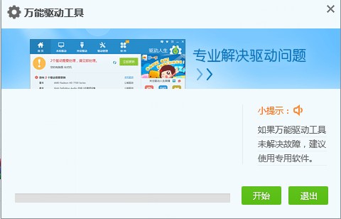 启动万能驱动工具,点击开始时,程序会静默安装万能网卡驱动。
