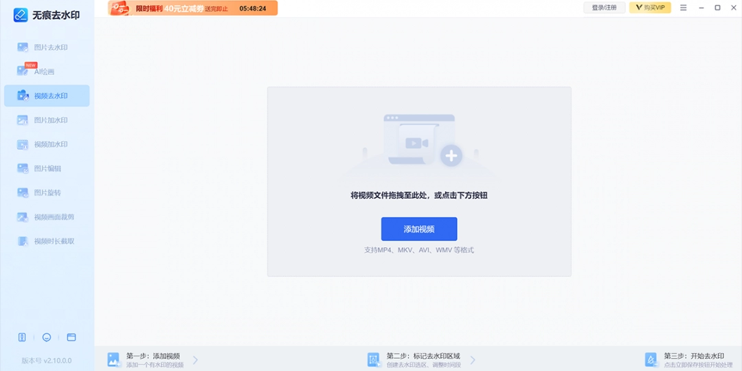 2、视频去水印:支持视频去水印,只需导入一个视频文件,选择视频水印区域,即可一键开启AI智能去水印功能,轻松去除视频水印,减少视频水印去除痕迹,保护视频质量。