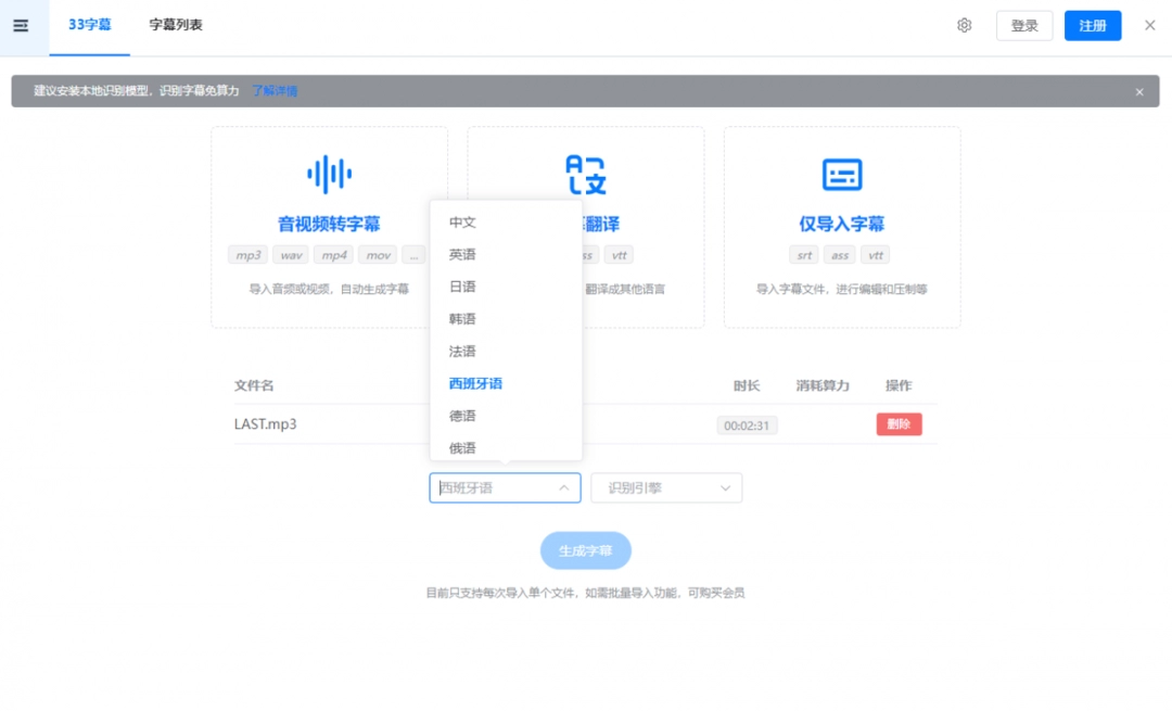 33字幕官方版是一款功能强大的AI字幕软件,软件界面简洁,操作简单易用,支持近50种语言的语音识别和文本翻译,拥有一键总结音视频内容、快速剪音频和视频等功能,还支持本地识别音视频,准确度高,一键导出视频和字幕,省心省力,满足了用户对字幕的需求,感兴趣的小伙伴快来下载体验吧!