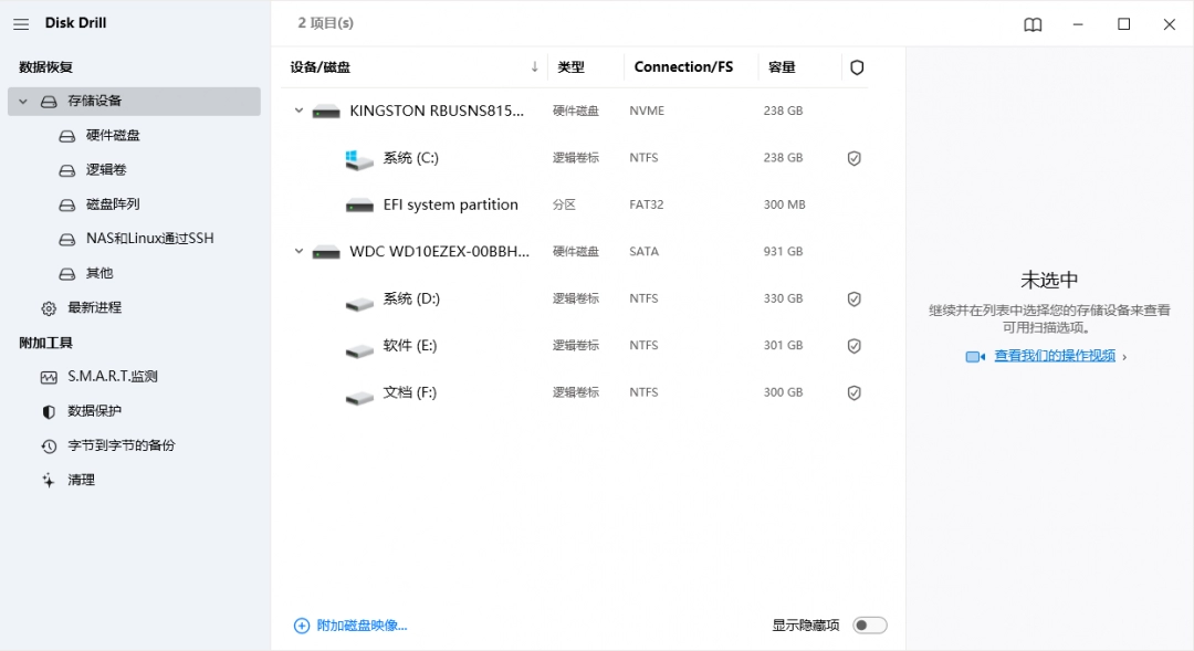 所有检测到的存储设备的视图现已展开,以便于查看。