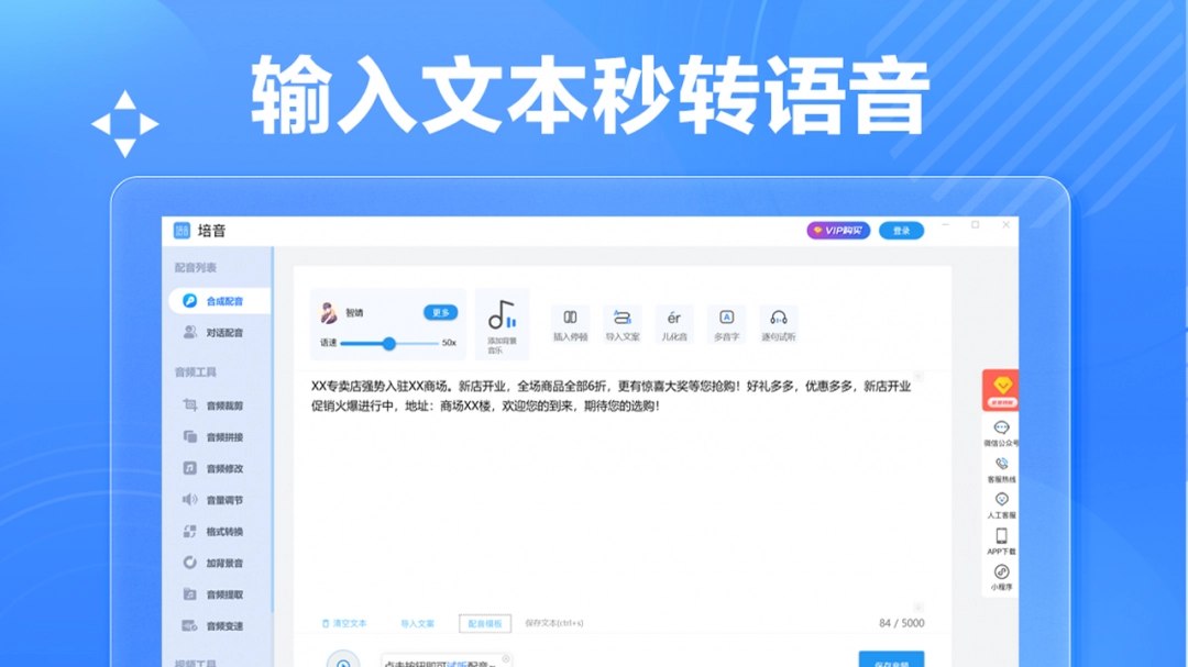 培音是一款文字转语音的专业配音软件,软件界面简洁,操作简单易用,海量背景音乐乐库,拥有文字转语音、添加背景音乐、调整音量等丰富功能,支持多语言切换,提供多种发音人和背景音乐选择,适用于广告、有声阅读、广播、影视等多种场景,满足您的各种配音使用需求,感兴趣的小伙伴赶快下载使用吧!