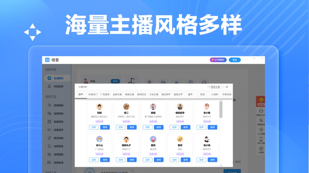 4、支持语音主播设置功能,可以选择抖音人气、广告宣传、金牌主播、情感主播、新闻资讯播报等类型的主播。