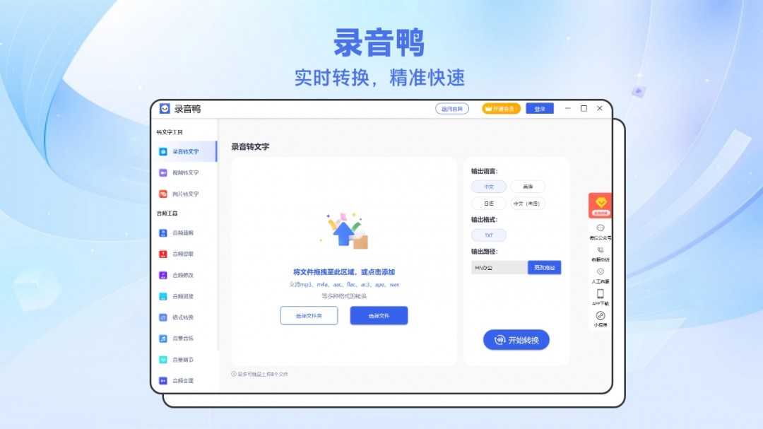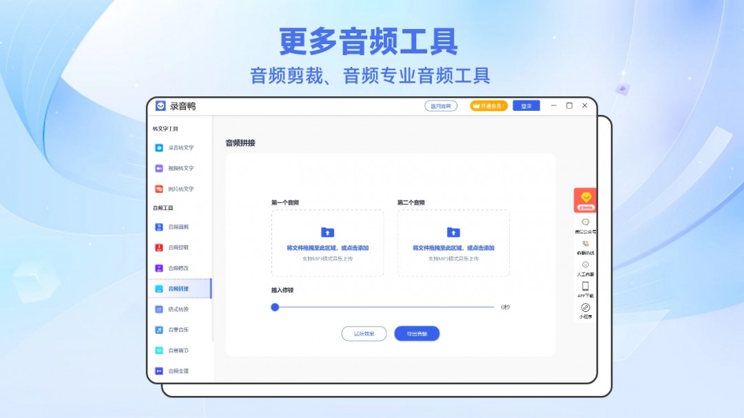 支持音频剪辑、音频提取、音频修改、音频拼接、音量调节、音频变速、添加背景音,支持多种音频格式之间的转换。
