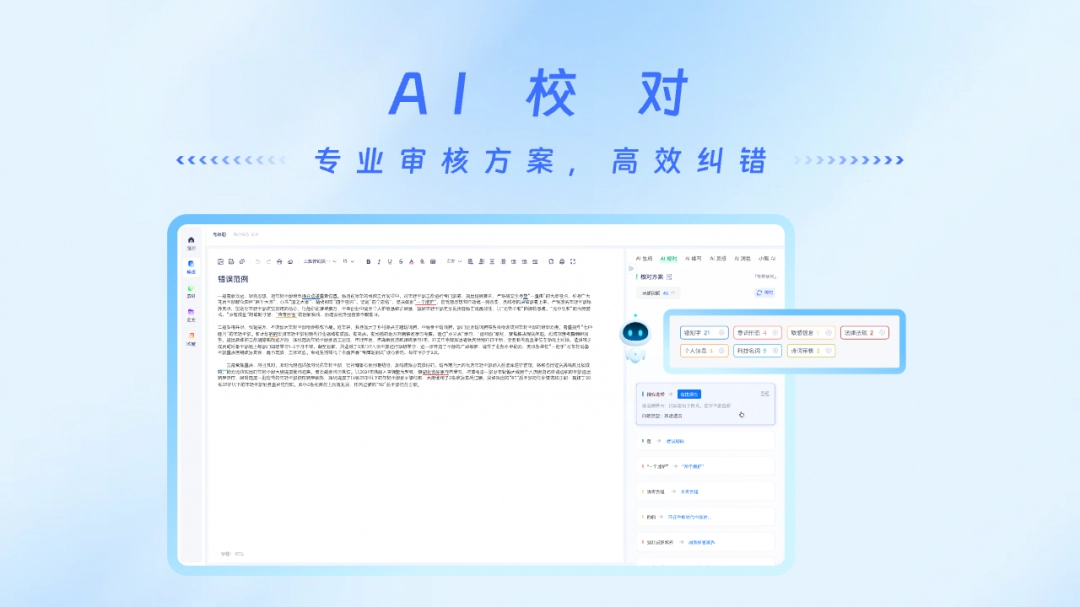 3、合规审核和校对纠错:具备合规审核功能,确保文稿的合规性,规避风险。
