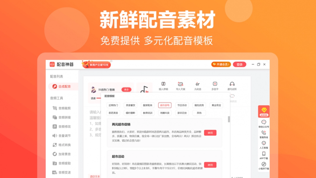 配音神器是一款非常实用的音频制作软件,软件界面简洁,操作简单易用,采用强大的语音合成技术,声音堪比真人发音的配音服务平台,拥有超多实用小工具,音频剪裁、格式转换、去除水印等,适用于影视解说配音、游戏解说配音、小说推文、促销广告配音等多种场景,有喜欢的小伙伴快来下载体验吧!