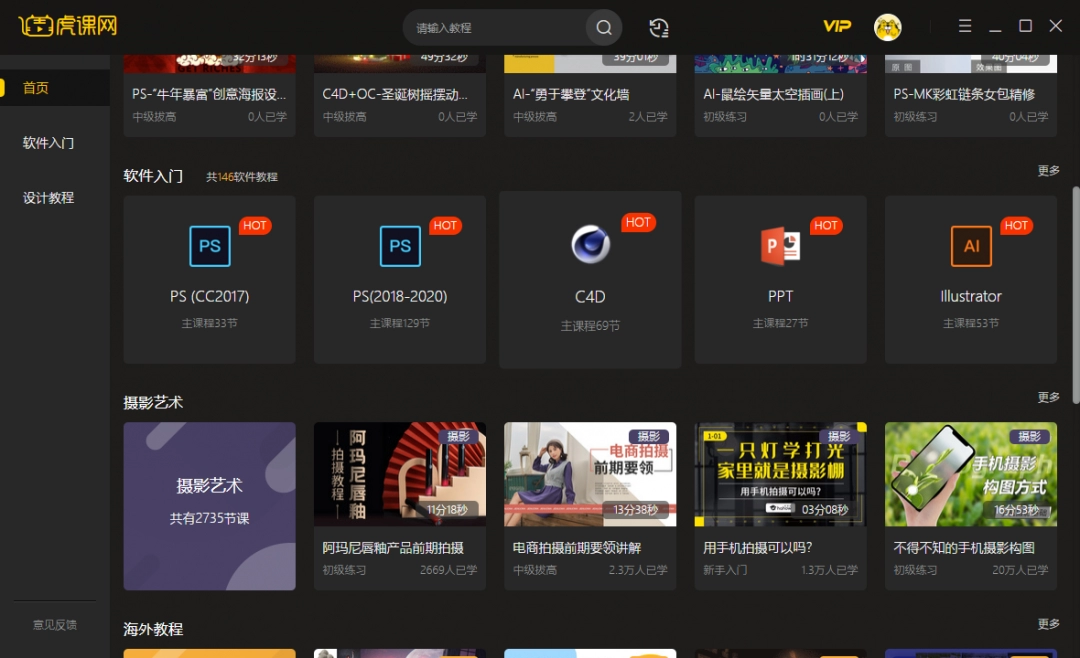 虎课网最新版是一款功能强大的视频学习软件,软件界面简洁,操作简单易用,支持PS、AI、AE、C4D、CAD、PR、PPT、WORD、EXCEL等140+软件教程,拥有平面设计、摄影摄像、视动画、短视频制作、职场办公、编程开发等领域,满足您的不同使用需求,有需要的小伙伴快来下载体验吧!