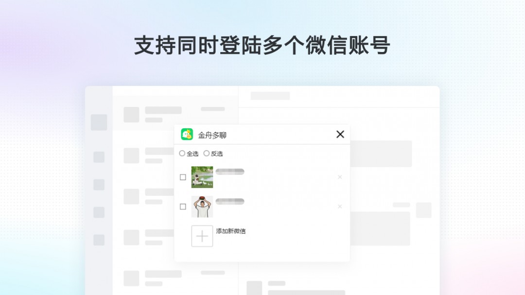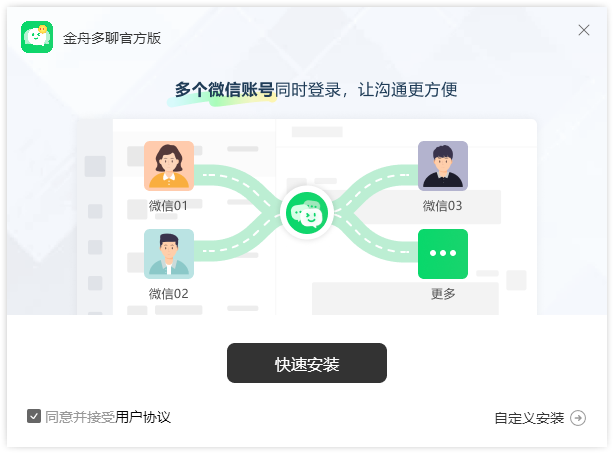 金舟多聊是一款非常易用的微信电脑PC版多开工具,软件界面简洁明了,操作简单易上手,支持同时登陆多个微信账号,快速高效接收、发送消息,微信消息提醒让管理更加便捷,拥有独创快捷键辅助功能,帮您快速切换微信账号与窗口界面,给用户带来了极大的使用便利,有效提升客服人员沟通效率,有需要的小伙伴赶快来下载试试吧!