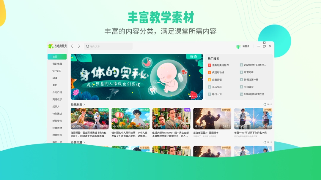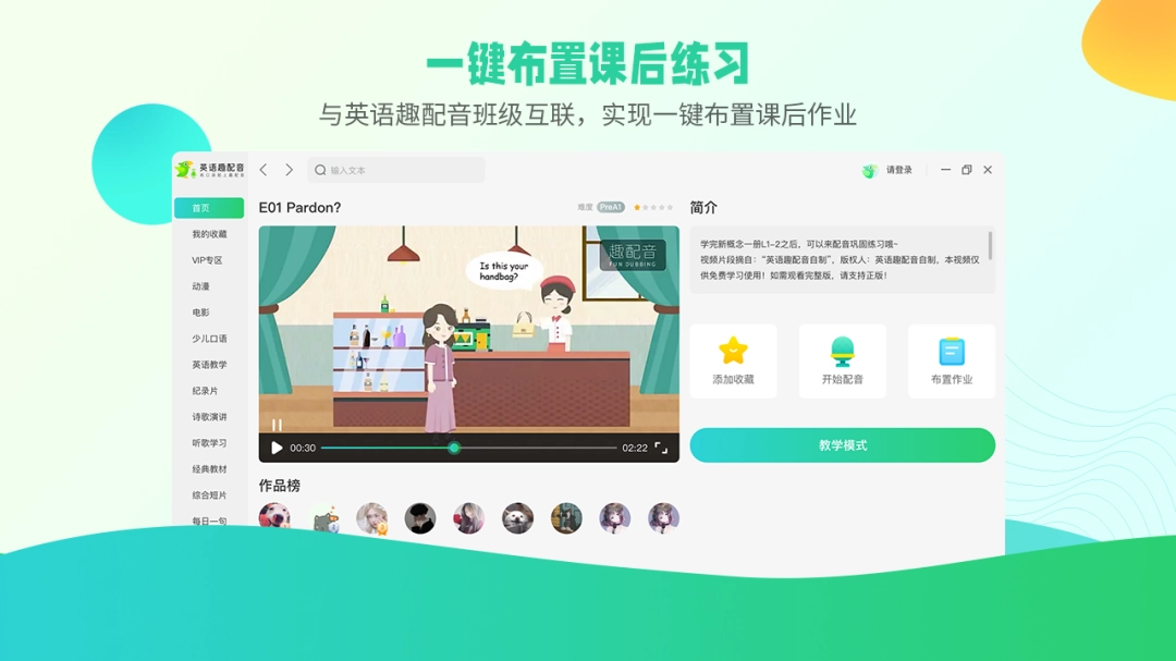 英语趣配音电脑版是一款非常实用的PC电脑英语学习软件,软件界面简洁,操作简单易用,采用了专业的考试真题视频,提供了海量的视频配音素材,包含最新潮的电影、美剧、影视、动漫、歌曲MV等视频,满足不同用户的学习需求,大大提高了学习效果,有需要的小伙伴快来下载体验吧!