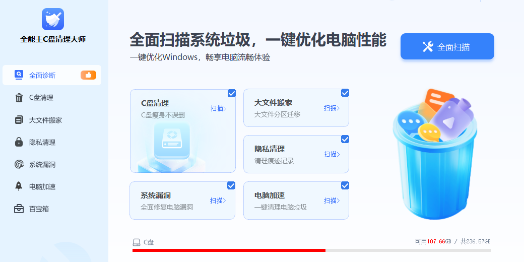 全能王C盘清理大师是一款非常专业的磁盘清理软件,软件界面简洁,操作简单易用,支持快速扫描清理C盘系统缓存文件,垃圾残留文件,临时文件以及回收站清空等,可以帮助用户快速清理无用文件、垃圾文件、临时文件、缓存文件等功能,满足不同用户的使用需求,欢迎有需要的用户下载体验!