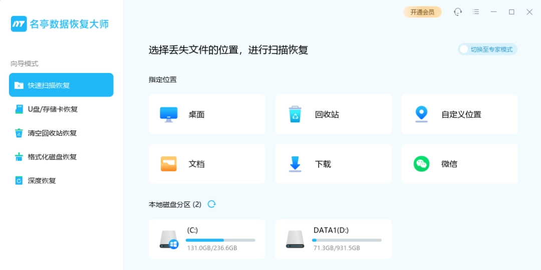 2、支持指定位置文件恢复:支持指定盘符、指定文件路径、常用文件夹恢复(桌面、回收站、我的文档、下载、微信)。