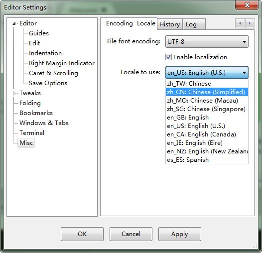 配置中文包,中文语言包解压后得到zh_CN文件夹,文件夹包含codelite.mo和codelite.po两个文件,将文件夹zh_CN直接复制到CodeLite安装目录下locale文件夹内。然后打开CodeLite软件,从菜单【Settings->Global Editor Preferences】进入Editor Settings页面,选择【Misc->Encoding Locale】,修改Locale to use的值为zh_CN:Chinese(Simplified),然后点【Apply】。