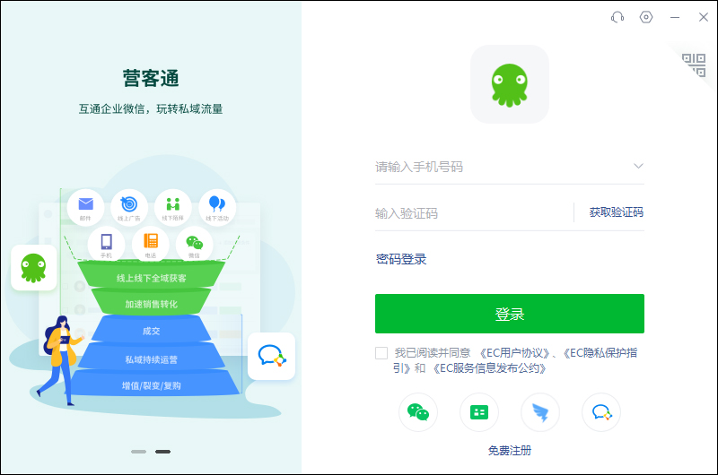 EC营客通电脑版是一款非常实用的营销沟通软件,软件功能强大,拥有客户管理、H5微营销、协同办公、外勤管理、在线客服等功能,可以方便地在手机和电脑上进行消息、图片、文件、群组等交流,适用于金融、教育培训、商务服务、互联网、物流、招商加盟企业、电子、房产等行业,感兴趣的小伙伴快来下载使用吧!