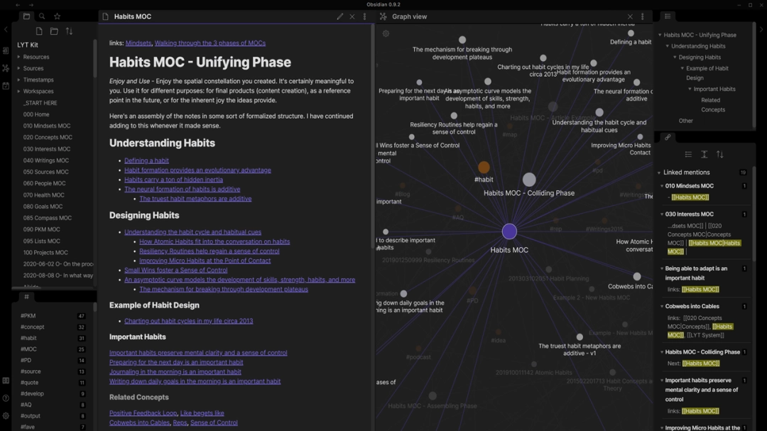 1、链接和反向链接:将单个笔记转换为相关想法的网络,自动生成反向链接,并包括上下文和未链接的引用。