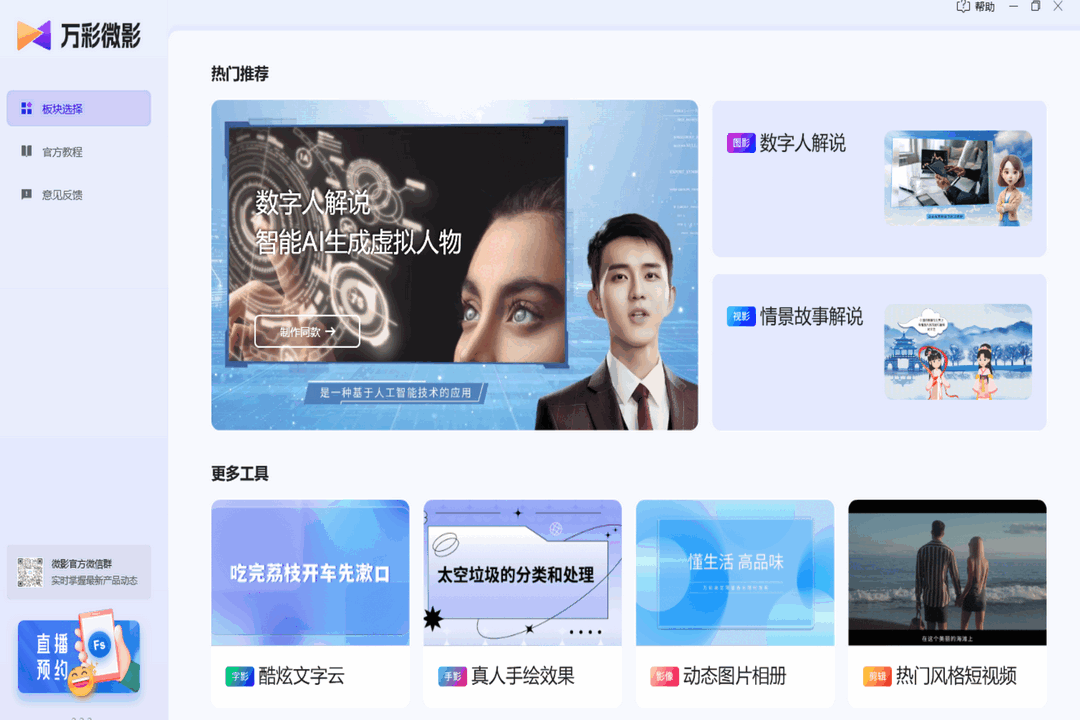 万彩微影是一款功能强大的剪辑软件,软件非常的实用,操作简单易用,海量素材库供用户使用,支持MP4、MOV、AVI、WMV、FLV、MKV等主流视频格式,可以广泛用于宣传,微课,动画短片等多个领域,大大的提高视频制作效率,满足不同风格手绘视频制作需求,有需要的小伙伴快来下载试试吧!