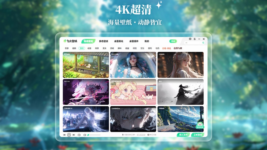 飞火动态壁纸是一款非常实用的电脑桌面美化软件,软件界面简洁,操作简单易用,海量的高质量精美动态壁纸和静态壁纸,包括动漫、游戏、萌宠、每年、科技、4k、桌面主题等类型,支持mp4、WebM、avi、m4vmov、wmv等多种格式文件导入,满足用户不同设备的壁纸美化需求,感兴趣的小伙伴赶快下载使用吧!