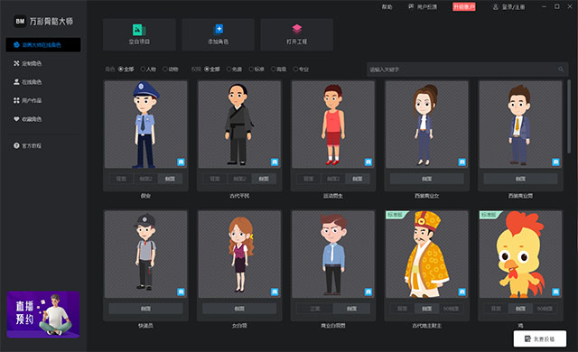 1、首页:新增静态角色分类,提供丰富矢量角色,并支持与万彩易绘大师联动编辑,让角色的构建和动态制作更简单流畅。