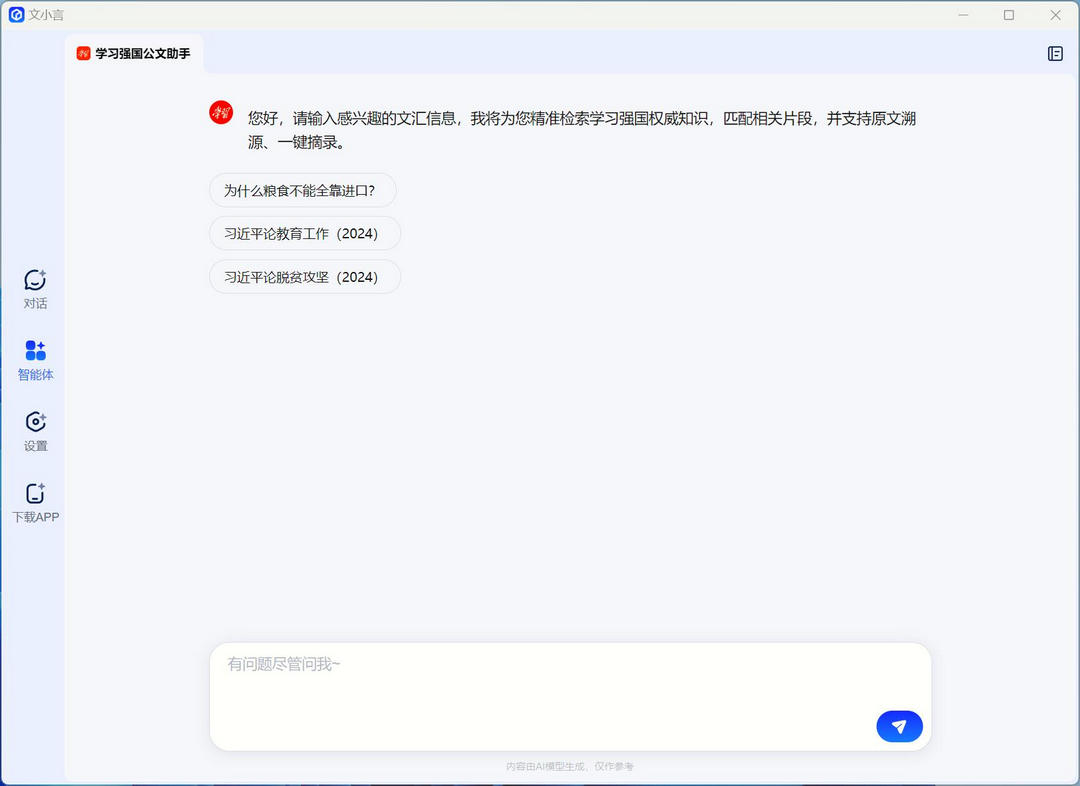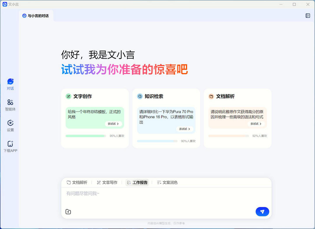 文小言是一款非常实用的新搜索智能助手,软件功能强大,操作简单易用,提供搜索、创作、语聊等高效AI体验,拥有多模态搜索、问题解答、文章创作、图片创作与识别、语聊数字人、自由订阅、专业智能体等丰富的AI能力,适用于多种场景,支持报告撰写、PPT制作、作业完成及复习等需求,感兴趣的小伙伴快来下载试试吧!