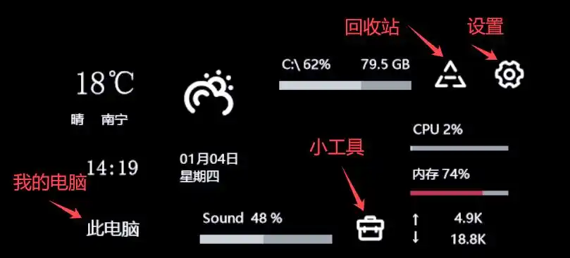 1、有悬浮小组件,支持自定义显示内容,试试显示硬件信息。