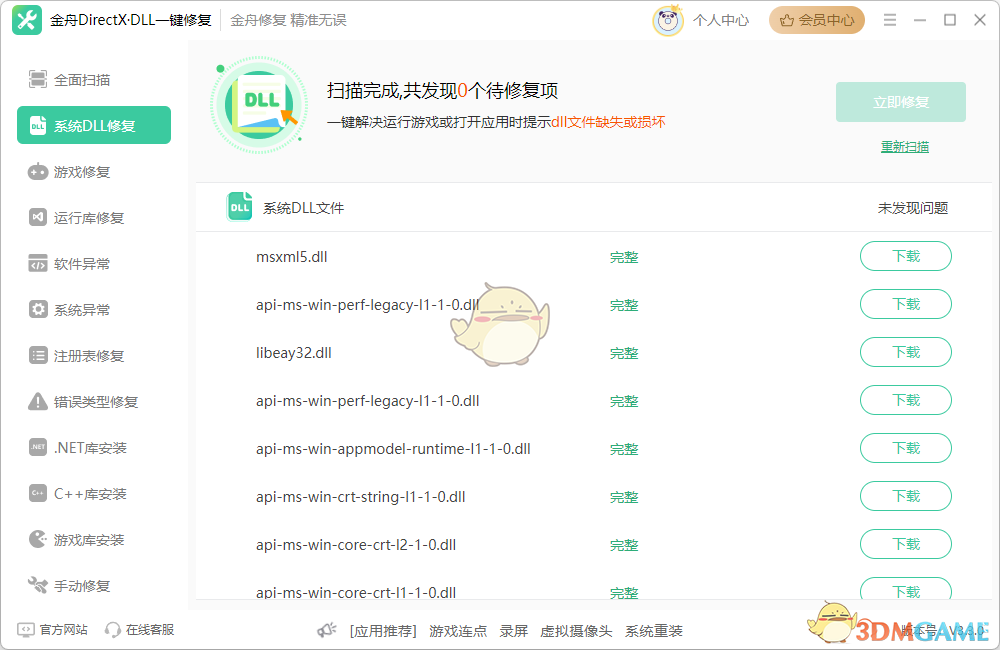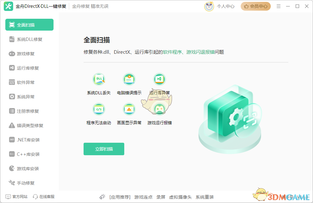 金舟DirectX·DLL一键修复是一款功能强大的系统修复工具,软件界面简洁,操作简单易用,支持更新c++组件,提高修复软件的概率,提供全面扫描、 DirectX 、运行库、系统DLL、手动修复五大模式,修复在电脑运行过程中,各种因为DLL丢失导致的常见软件和游戏报错问题,感兴趣的小伙伴赶快下载体验吧!